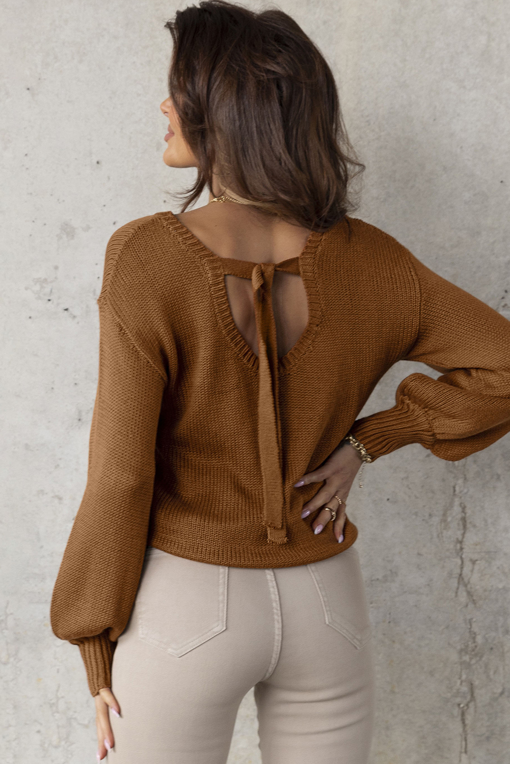 Maak indruk met de Ambré™ Bruine Trui met Open Rug & Strik – waar comfort en verfijnde sensualiteit samenkomen.