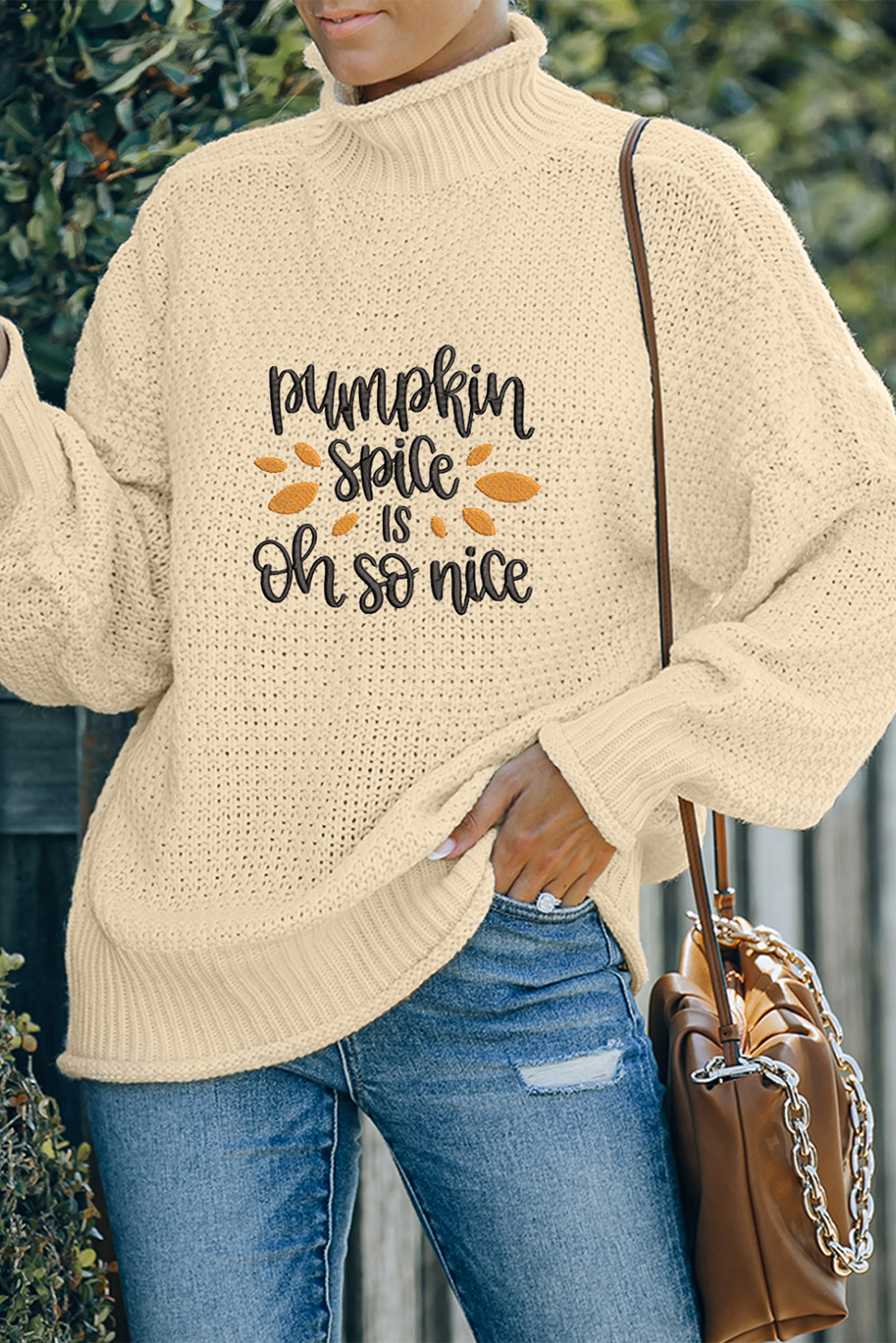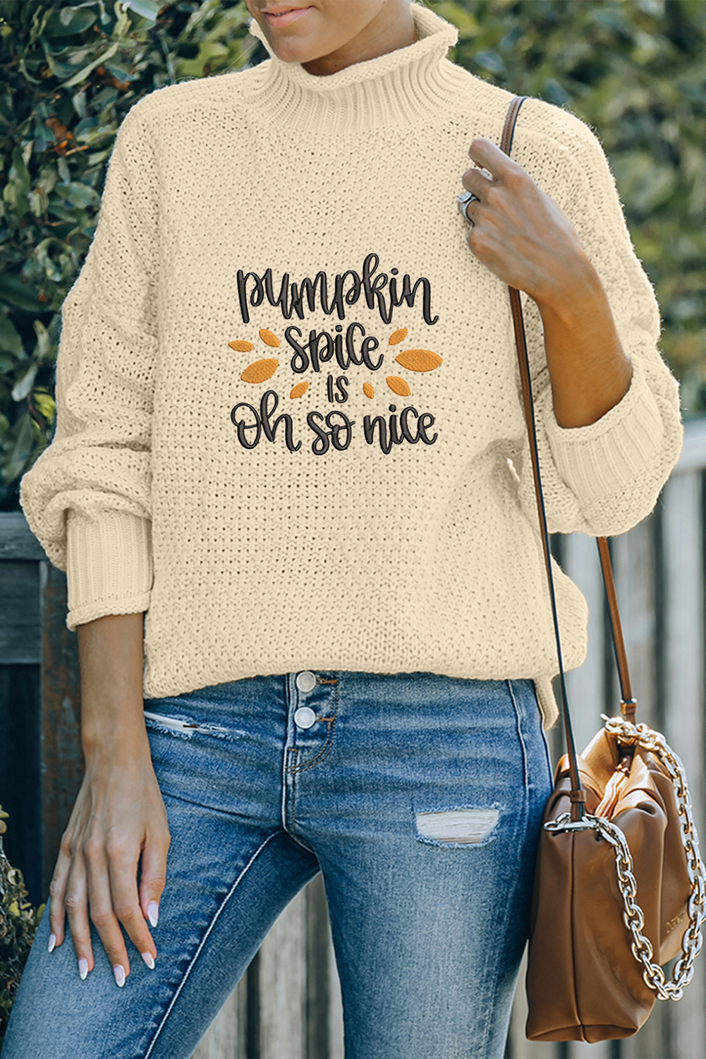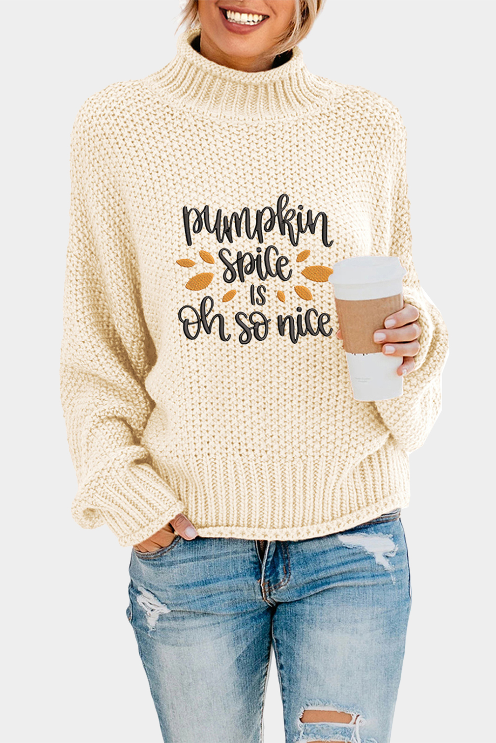 Met zijn geborduurde slogan “Pumpkin Spice Is So Nice”, hoge kraag en zachte beige tint straalt deze trui pure herfstvibes uit.