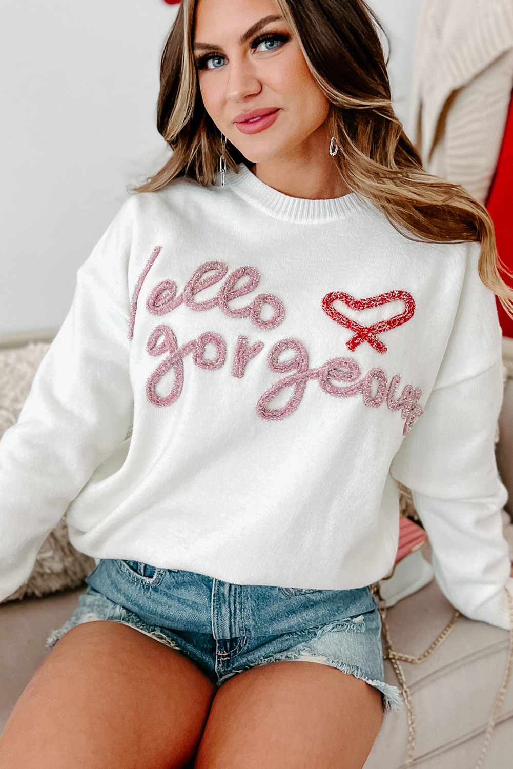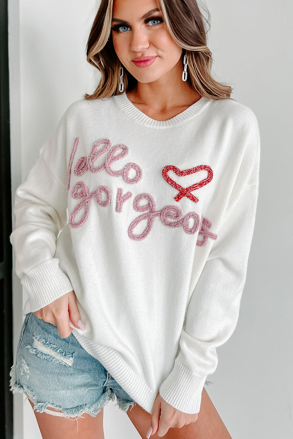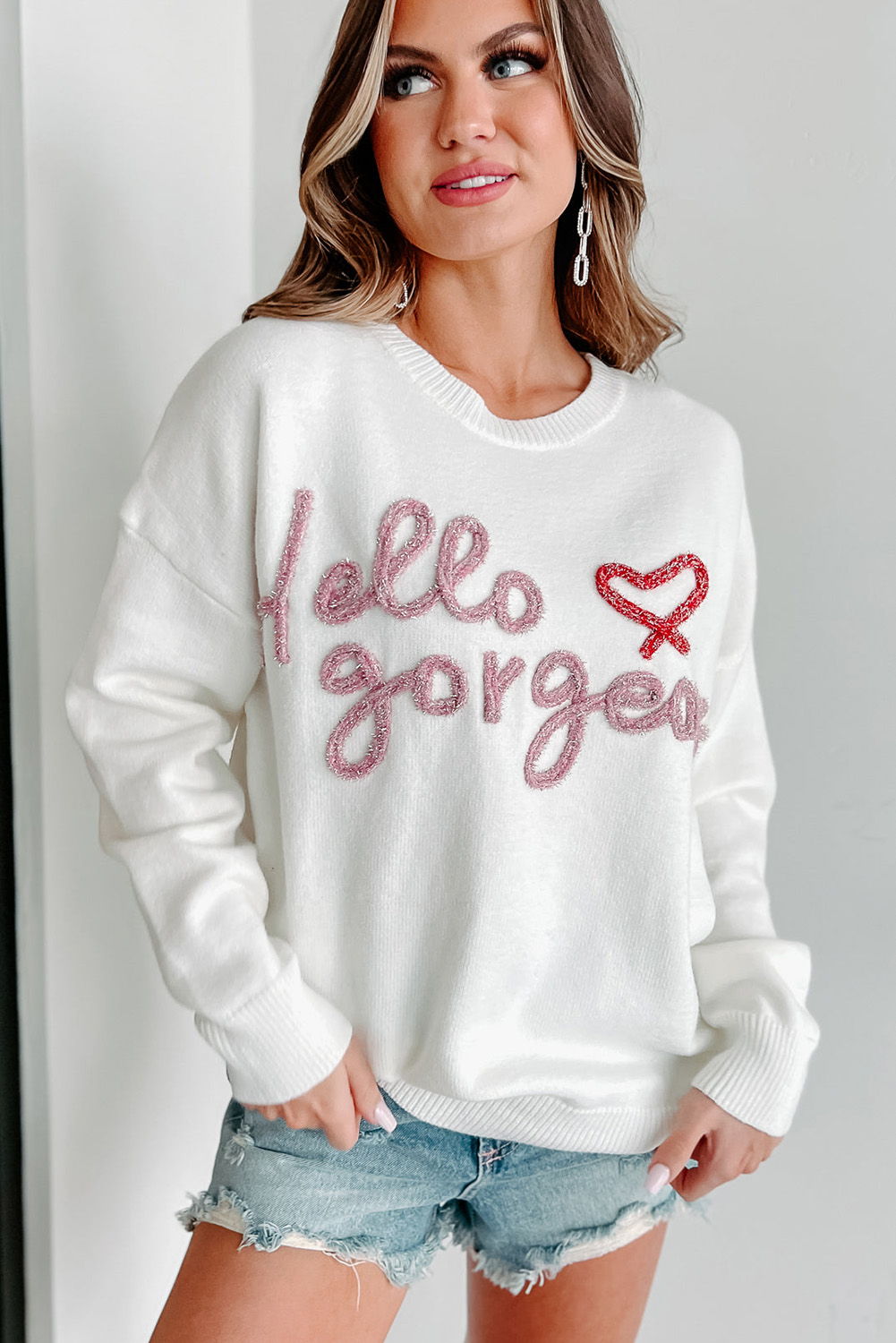 Laat je zelfvertrouwen stralen met de Hello Gorgeous™ Graphic Ribbed Trim Sweater – een perfecte mix van casual comfort en vrouwelijke elegantie.