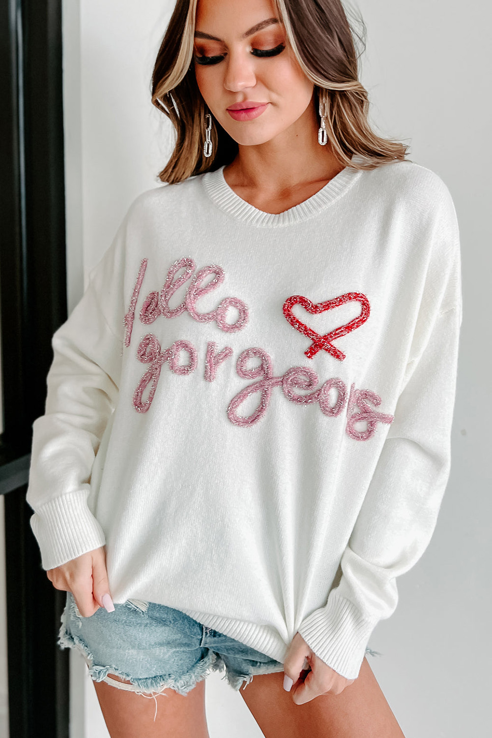 Voeg een vleugje positiviteit toe aan je garderobe met de Hello Gorgeous™ Graphic Ribbed Trim Sweater.