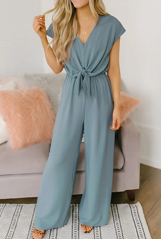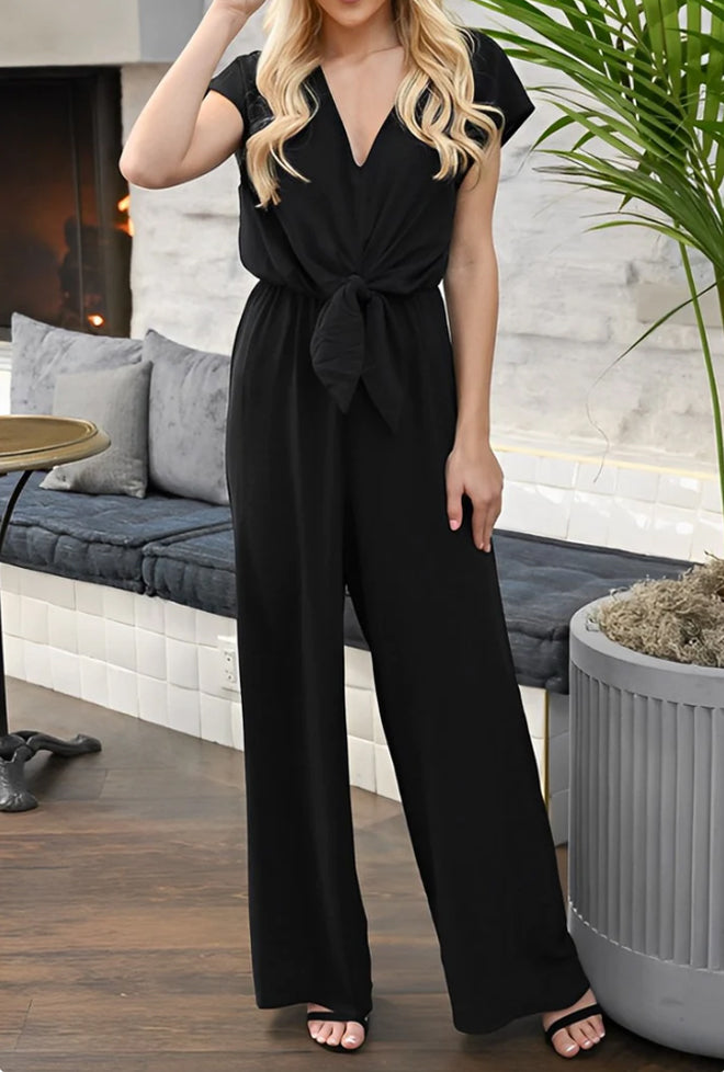 Het gedurfde rugloze ontwerp en de diepe V-hals creëren een flatterende en vrouwelijke look, terwijl de losse broekspijpen zorgen voor ultiem draagcomfort.